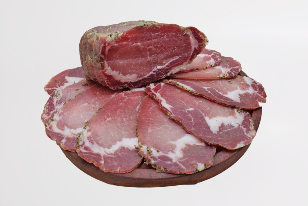 Elaborado a partir de carré de cerdo deshuesado, cuidadosamente seleccionado por su ternura y suavidad, y recubierto con pimienta verde, que aporta un aroma fresco y un picor delicado y equilibrado.